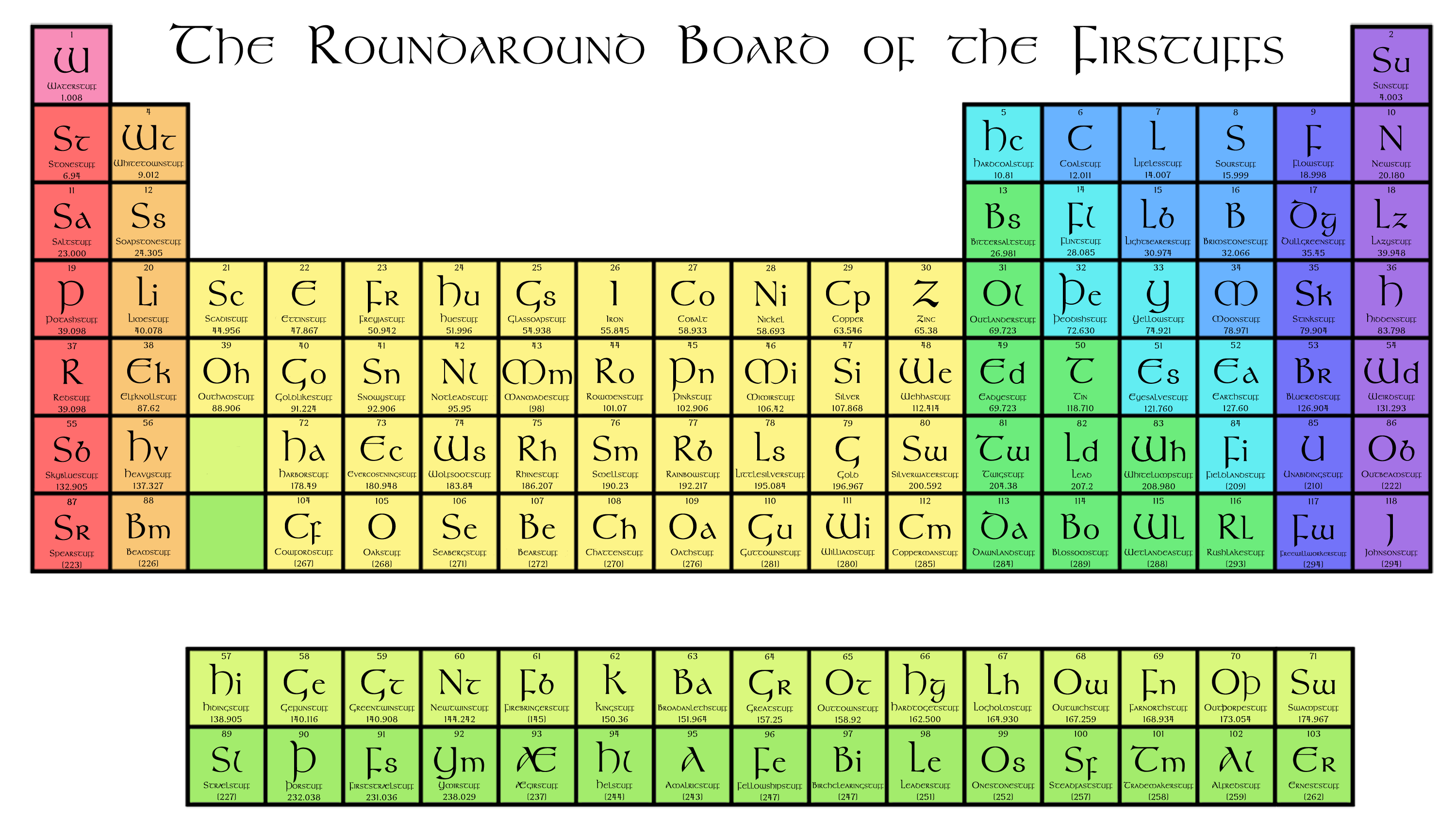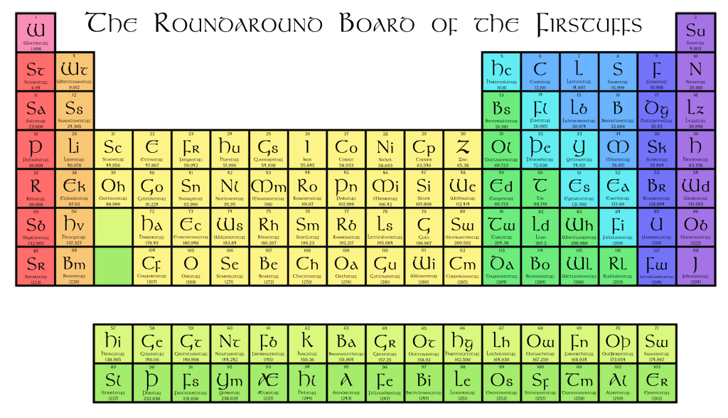 Inspired by Poul Anderson’s essay Uncleftish Beholding – wherein he explains the basics of atomic theory without using any English words of non-Germanic origin – I wanted to make a Periodic Table of the Elements (or, “Roundaround Board of the Firststuffs”, as he calls it) doing the same. I put one together (made with Crayon!) a few years ago, but updated/corrected some names and added the four elements the IUPAC settled on names for last year.