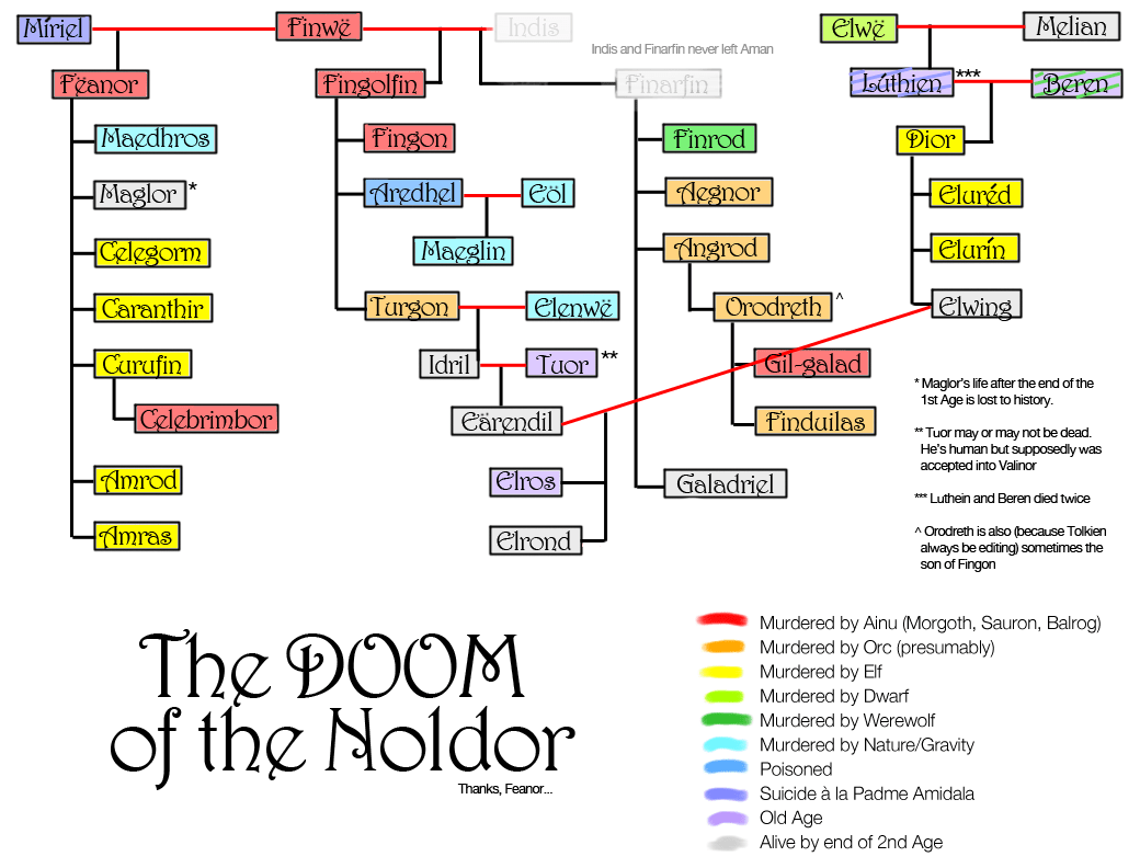 Errata: technically the CODs for Eluréd and Elurín are unknown, as they were let loose into the woods of Doriath after Feanor’s sons sacked Menegroth and killed their parents (For some reason I forgot to add Nimloth). The Silmarillion says they were never seen or heard from again; it’s presumed they starved to death. So really they should be coloured cyan, even though it’s Celegorm’s fault.